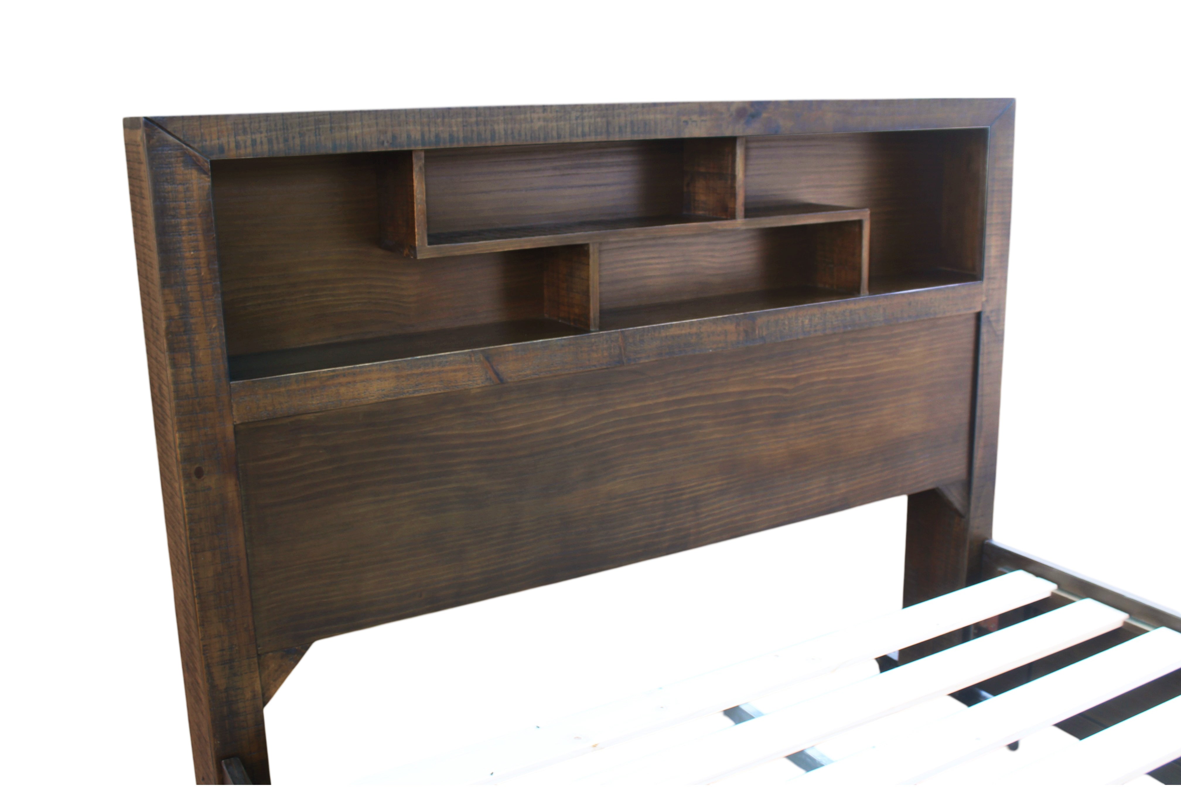 • Headboard shelf storage feature